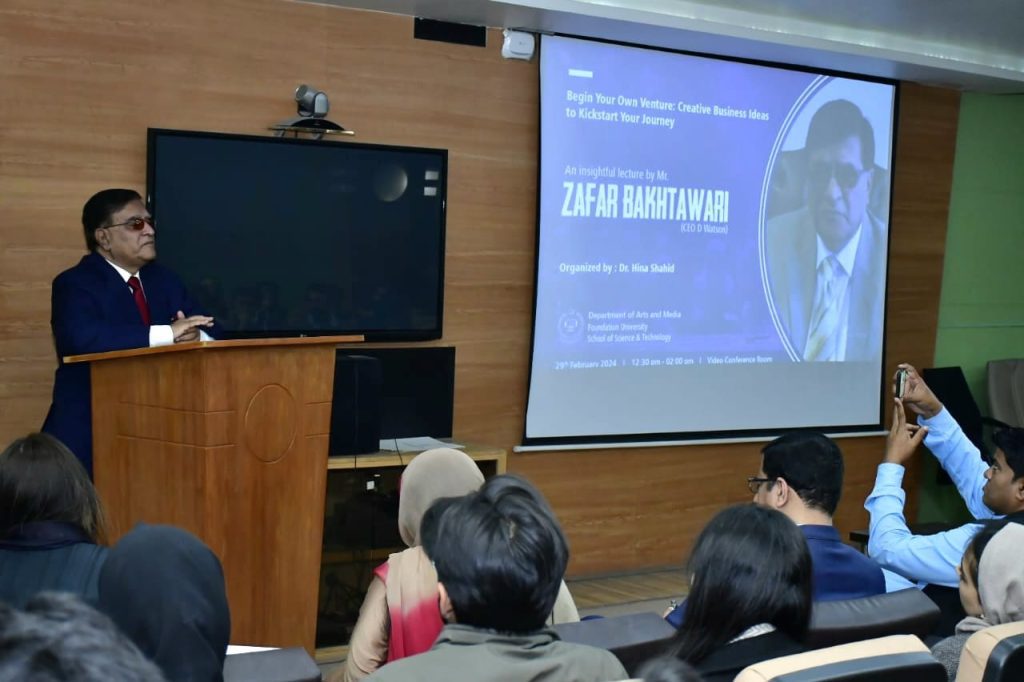 Islamabad, The Gulf Observer: Department of Arts and Media at Foundation University School of Science and Technology welcomed Mr Zafar Bakhtawari, CEO D Watson as the eminent speaker in its distinguished leaders’ series on “How to Begin Your Venture: Creative Business Ideas to Kickstart Your Journey” on February 29th, 2024. Dr Hina Shahid, Head Department of Arts and Media welcomed Mr Zafar Bakhtawari CEO D Watson and Mr Khalid Taimur Akram, Convener of “Foreign Affairs for Investment & Entrepreneurship Sub-Committee” of Islamabad Chamber of Commerce and introduced them to various academic activities of the department. This insightful and motivational lecture aimed at nurturing and motivating the entrepreneurial spirit among students pursuing Bachelor of Computer Arts and BS Media & Communication.