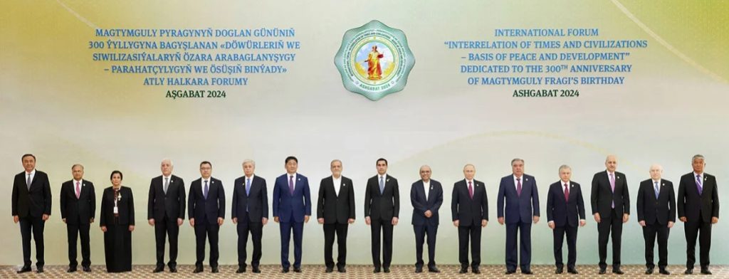 The International Forum “Interconnection of Times and Civilizations—the Basis of Peace and Development,” held on 11 October 2024, in Ashgabat, Turkmenistan, marked the celebration of the 300th anniversary of the birth of the great Turkmen poet and thinker, Magtymguly Fragi. Under the chairmanship of President Serdar Berdimuhamedov, the forum convened world leaders, including heads of state from countries like Armenia, Iran, Kazakhstan, Kyrgyzstan, Mongolia, Pakistan, Russia, Tajikistan, Uzbekistan, and Türkiye, along with prominent diplomats, cultural figures, and international scholars. The event aimed to honor the enduring legacy of Magtymguly while fostering cultural dialogue and highlighting the role of historical heritage in promoting peace and development.